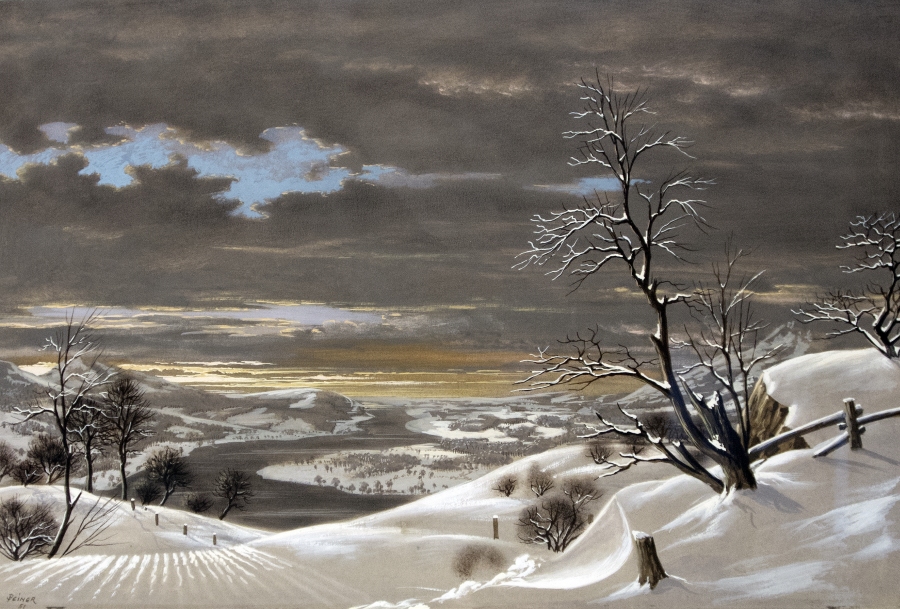 Werner Peiner Düsseldorf 1897 – 1984 Abendliche Winterlandschaft Tempera und Gouache; H 393 mm, B 585 mm (Passepartoutmaß); signiert und datiert u. l. “Peiner 51“