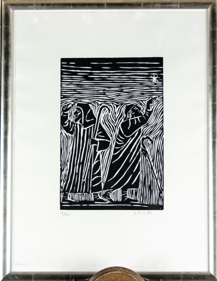 Gerhard Marcks 1889 Berlin – 1981 Burgbrohl 1918 durch B. Paul an die Berliner Staatl. Kunstgewerbeschule berufen; kam 1919 ans Bauhaus in Weimar; 1925 durch Thiersch an die Kunstgewerbeschule in Halle berufen; 1928 Villa-Romana-Preis; 1979 wurde er zum 90. Geburtstag durch Ausstellungen in Berlin, Bremen, Köln und Nürnberg geehrt; Träger des Großen Bundesverdienstkreuzes; 1980 wurde er Ehrenmitglied der Academy of Letters in New York, gemeinsam mit Max Ernst und Karlheinz Stockhausen. Die Hirten (Stern von Bethlehem) Holzschnitt auf Papier, 1954/55; H 320 mm, B 215 mm; signiert u. r. “G Marcks“; nummeriert u. l. “15/40“