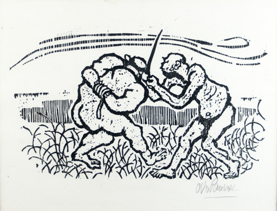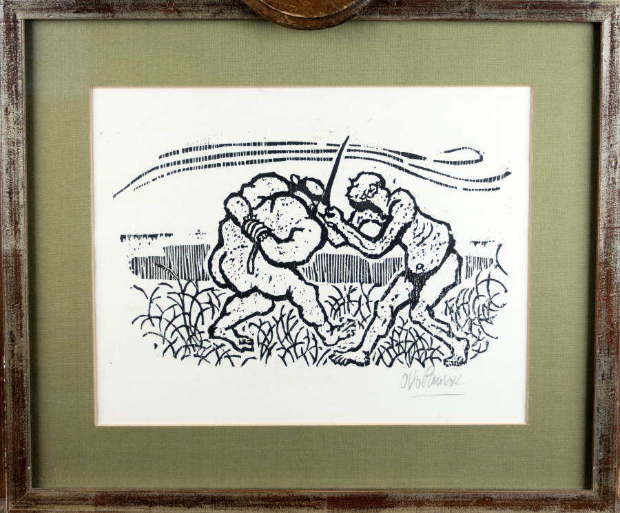 Otto Pankok 1893 Mülheim/Ruhr – 1966 Wesel Studium an der Düsseldorfer Kunstakademie und an der Kunstschule in Weimar; galt 1933-45 unter den Nationalsozialisten als “entartet“; seit 1945 Professor an der Staatlichen Kunstakademie Düsseldorf; mit zahlreichen Werken vertreten im Museum an der alten Post (Mülheim a. R.) und im Otto Pankok Museum (Hünxe). Der Gefangene Holzschnitt auf Papier; H 208 mm, B 325 mm; signiert u. r. “Otto Pankok“