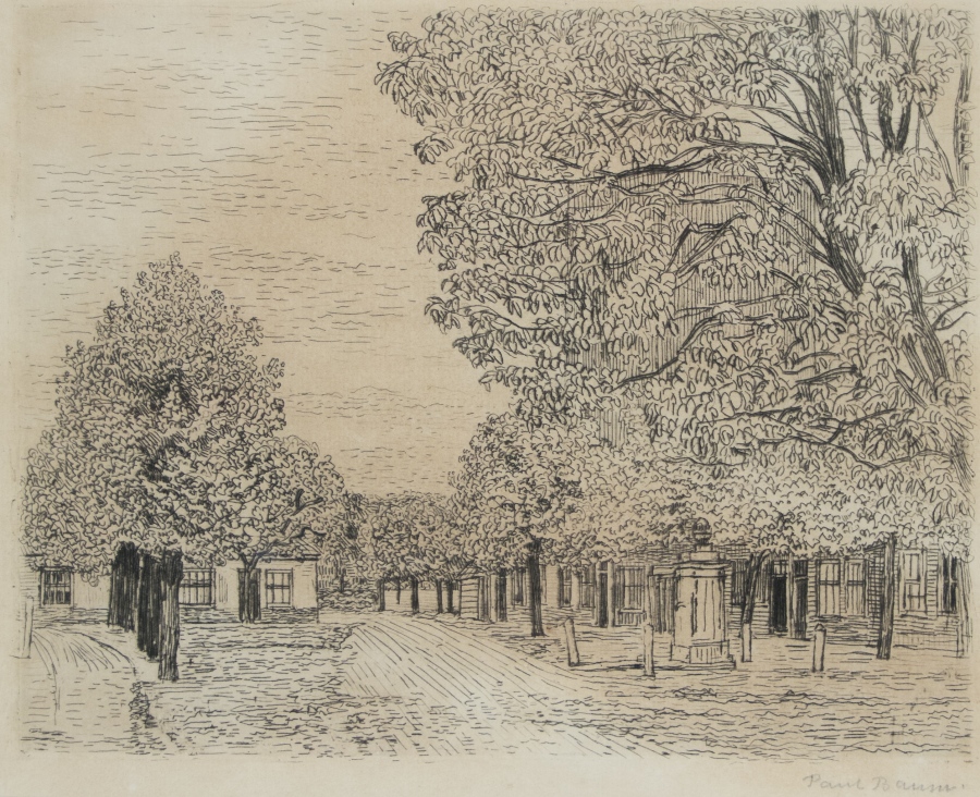Paul Baum 1859 Meißen – 1932 San Gimignano Studium an der Kunstakademie Dresden und in Weimar bei Th. Hagen; Reisen als Landschafter durch Deutschland, Niederlande, Italien und Frankreich; beeinflusst durch Baisch und Dücker; schloss sich 1888 der Dachauer Malerkolonie an; zog nach 1914 zunächst wieder nach Dresden, wo er zum Professor der Akademie ernannt wurde; 1918 Lehrer für Landschaftsmalerei an der Kasseler Kunstakademie; erhielt 1927 die Ehrendoktorwürde durch die Universität Marburg. Der Marktplatz von St. Anna mit Bäumen und dem Brunnen Radierung auf Papier; H 185 mm, B 235 mm; signiert u. r. “Paul Baum“