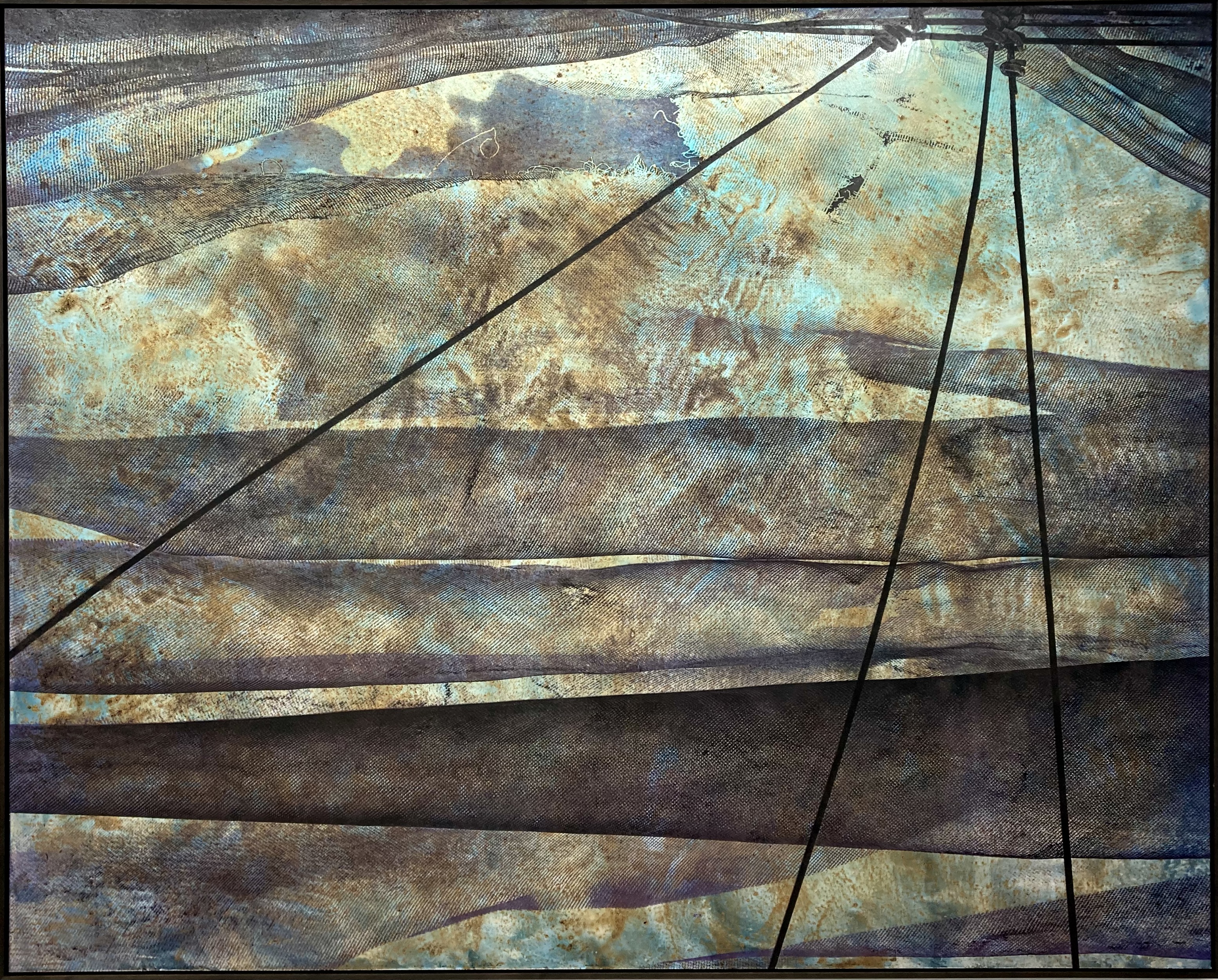 Mischtechnik mit Vulkangestein, Pigment, Aquarell auf Negativ über Aludibondplatte, 2024; H 120 cm, B 150 cm; verso bezeichnet, signiert und datiert "Invernadero VIII V1 Saupe 2024"