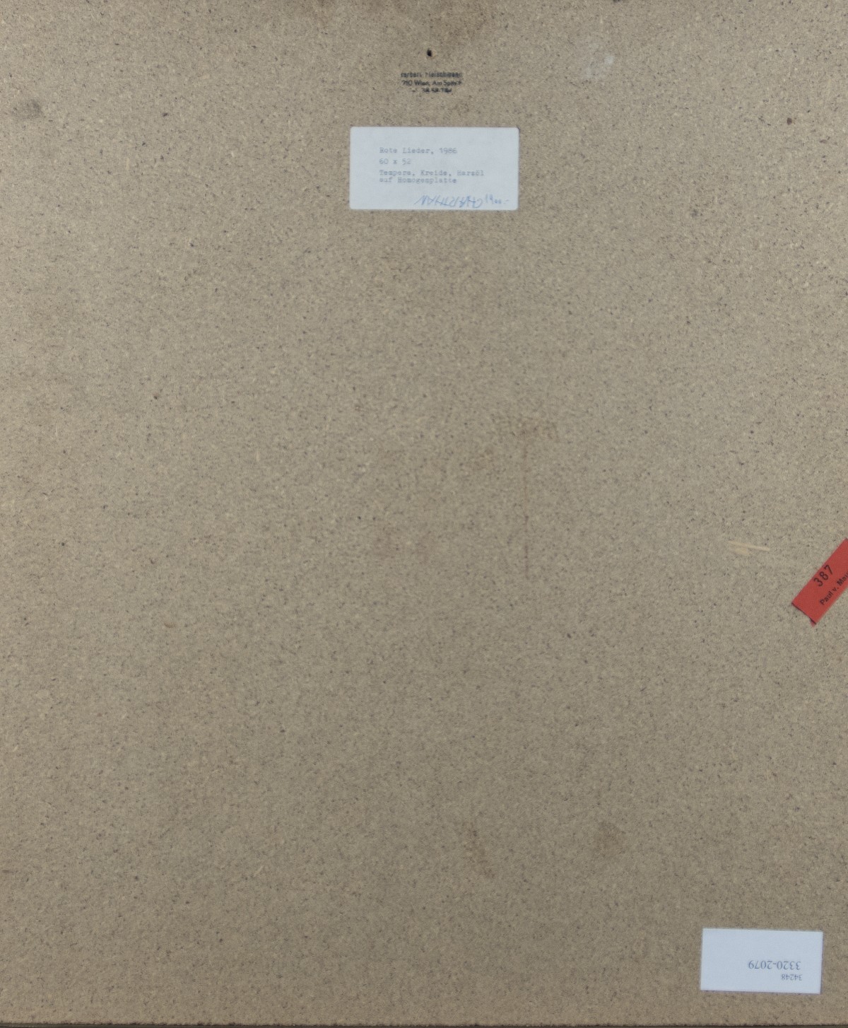 Tempera, Kreide und Harzöl auf Hartfaserplatte; H 60 cm, B 52 cm; verso Etikett mit Beschreibung und Datierung 1986; verso Stempel "Herbert Fleischmann Wien"