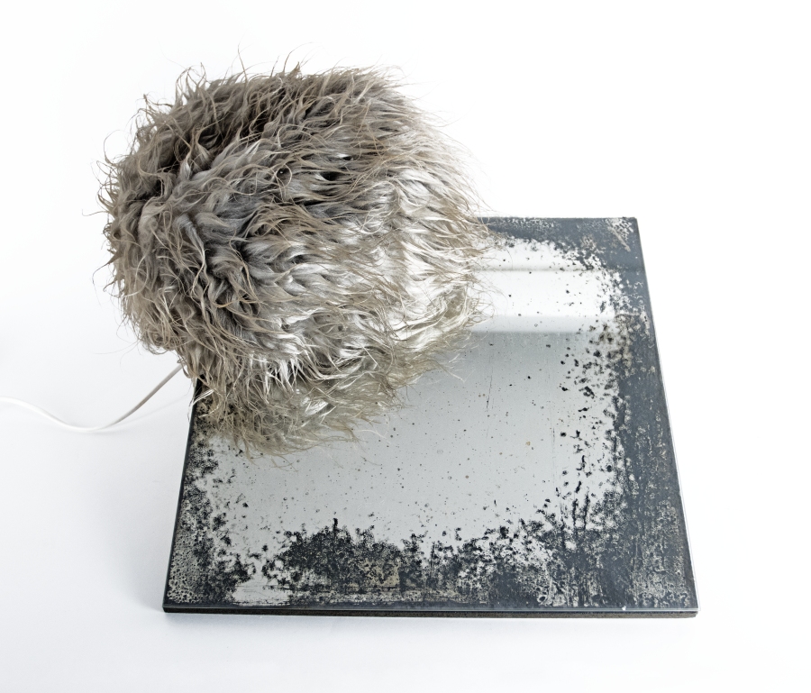 Fur with electric motor over oxidized mirror and wooden plate, 1977; H 47 cm, W 48 cm, D