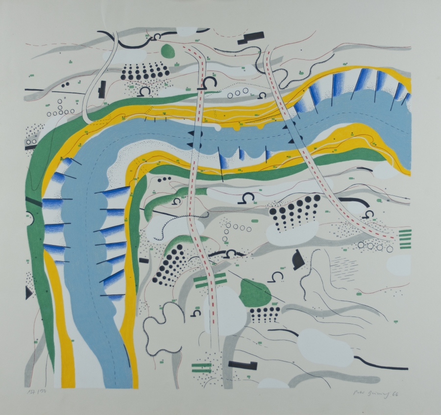 Color serigraph on paper; H 530 mm, W 570 mm; signed and dated lower right “Peter Brüning