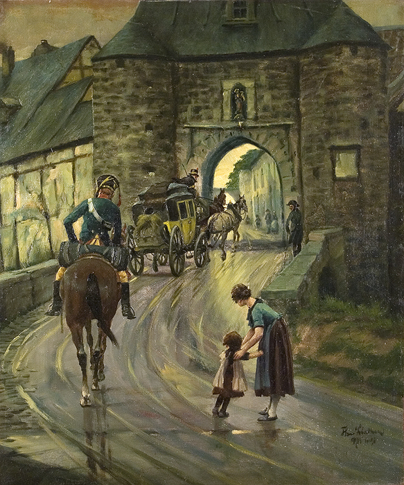 Lindner, Theodor: Postkutsche und Husar am Stadttor