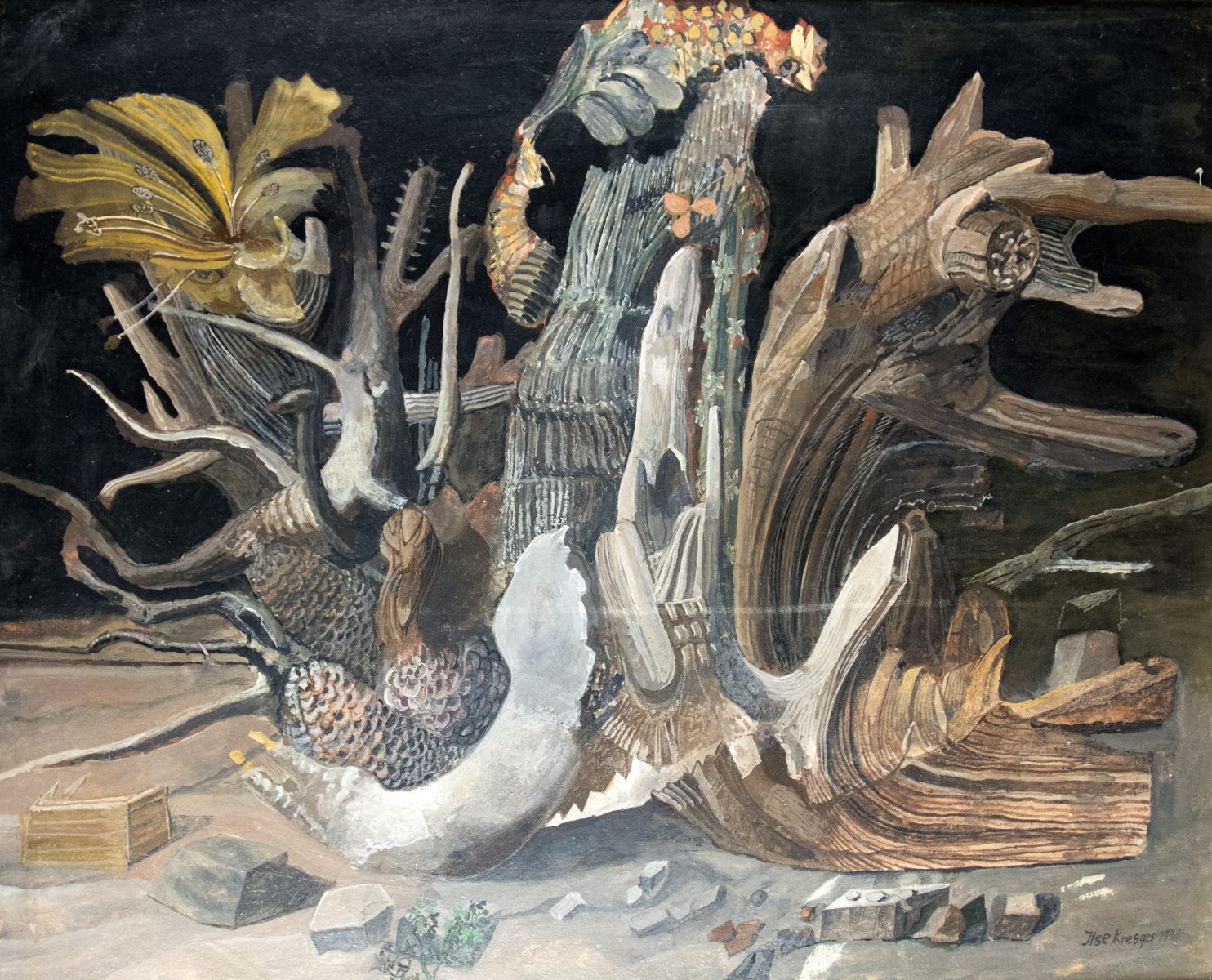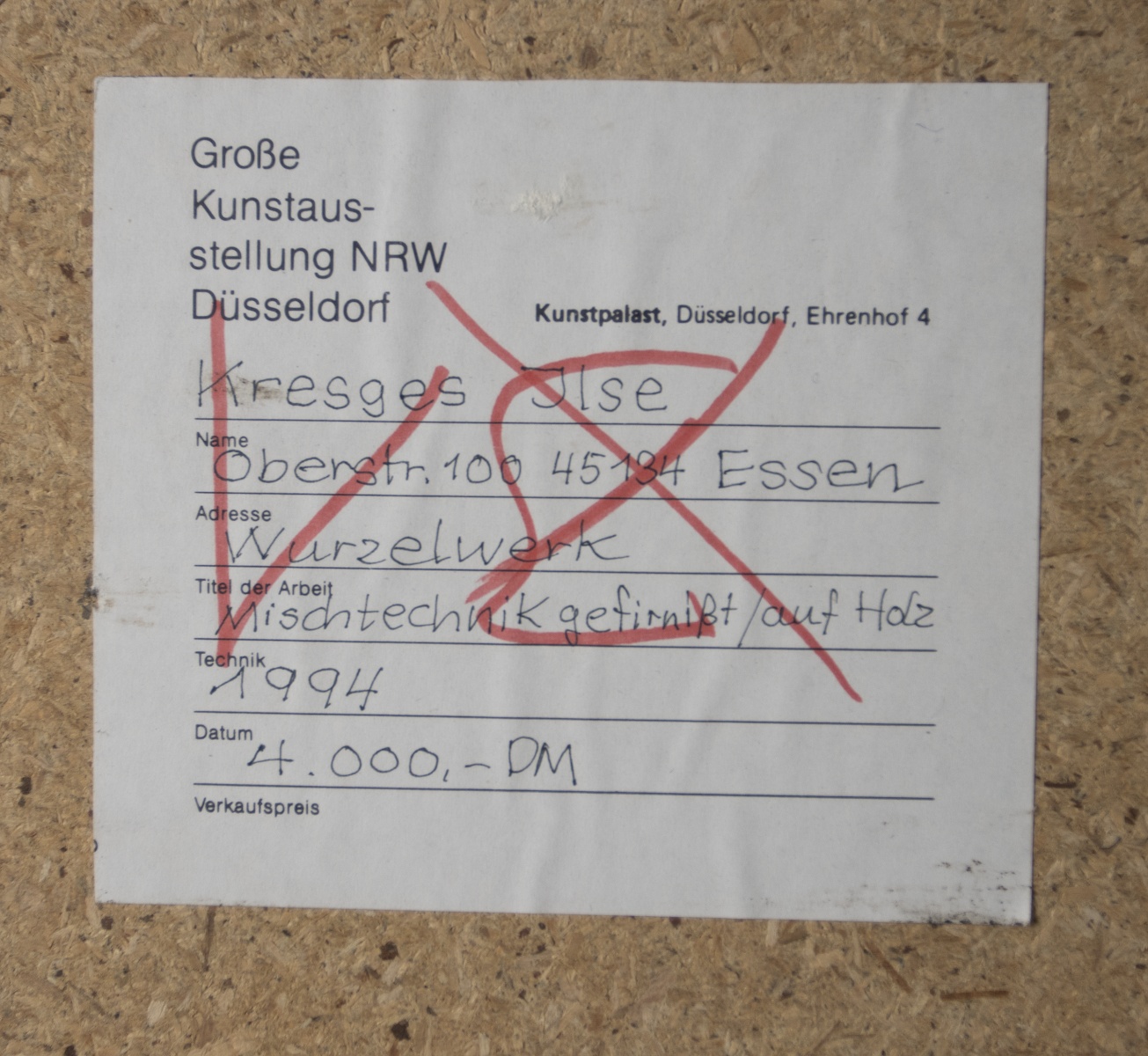 Ilse Kresges Deutsche Malerin; Ehefrau von Hermann Kresges. Ohne Titel Mischtechnik auf Press-Spanplatte, 1993; H 61 cm, B 75 cm; signiert und datiert u. r. “Ilse Kresges 1993“; verso Etikett “Grosse Kunstaustellung Düsseldorf, Kunstpalast Ehrenhof 4“ mit Beschreibung