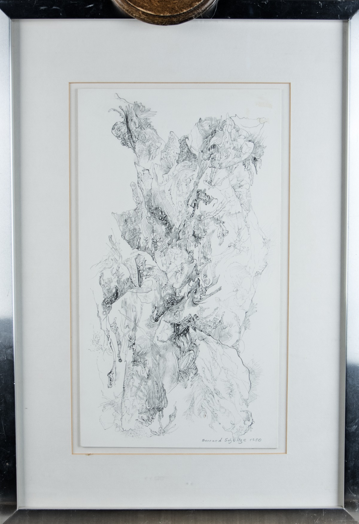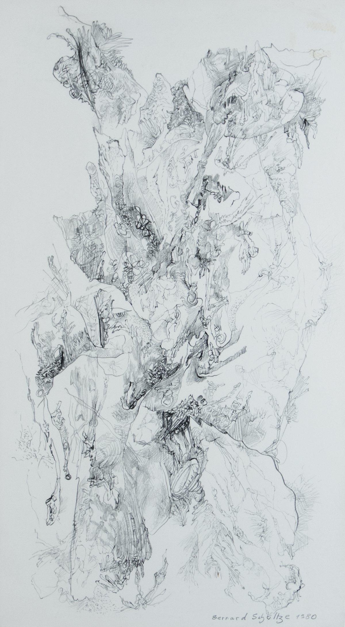 Bernard Schultze 1915 Schneidemühl – 2005 Deutscher Maler des Informel; Studierte 1934 bis 1939 an der Hochschule für Kunsterziehung in Berlin und an der Kunstakademie in Düsseldorf; Zwischen 1972 und 1992 Mitglied der Akademie der Künste in Berlin; Unternahm Studienreisen in die USA, viele asiatische Länder, Mexiko und Guatemala; Gründete 1952 zusammen mit Karl Otto Götz, Otto Greis und Heinz Kreutz die Künstlergruppe Quadriga; Teilnehmer der documenta II, III und VI; Wurde 2002 gemeinsam mit den anderen Malern der Quadriga mit dem Binding-Kulturpreis ausgezeichnet. Ohne Titel Bleistift auf Papier; H 395 mm, B 220 mm; signiert u. r. “Bernard Schultze 1980“