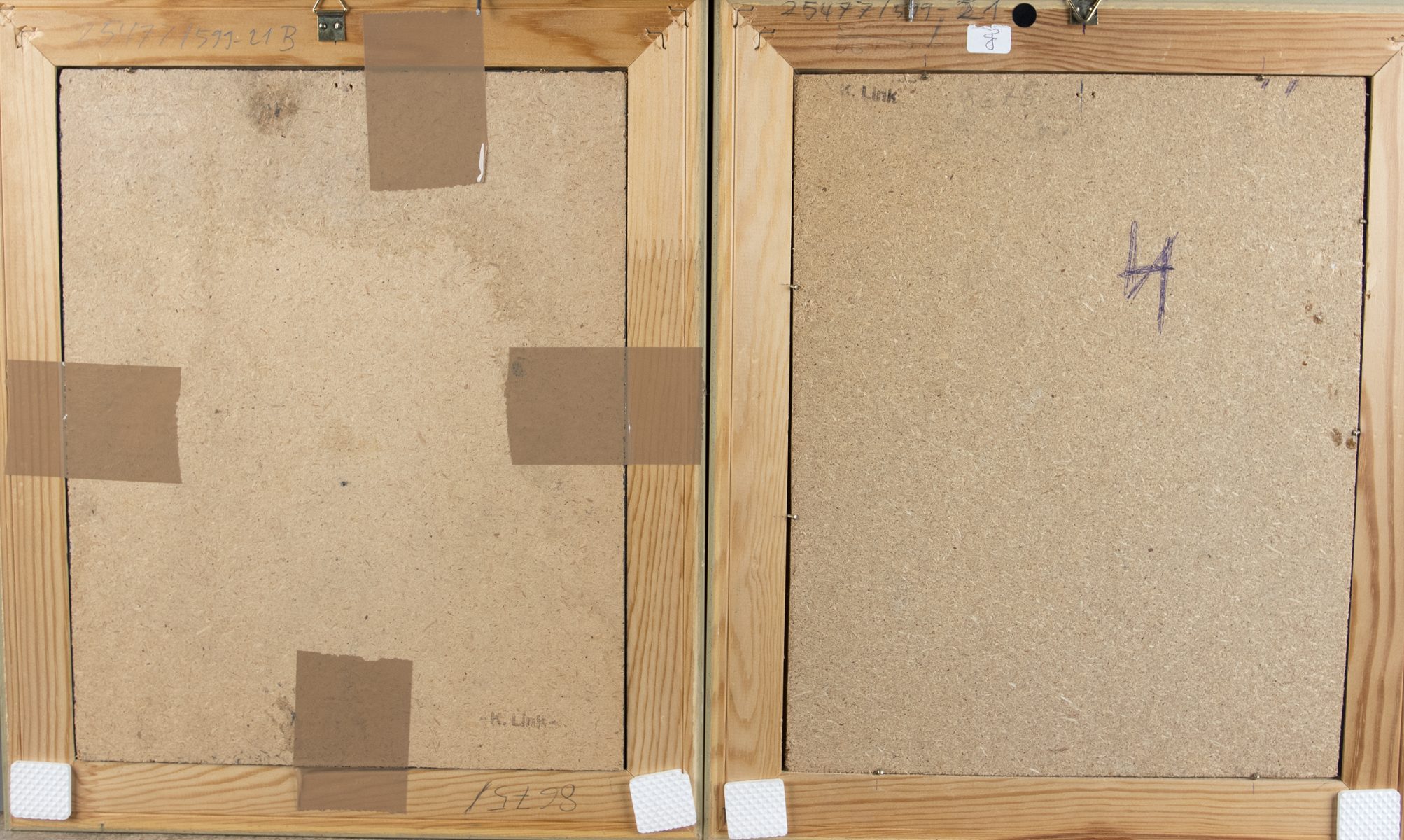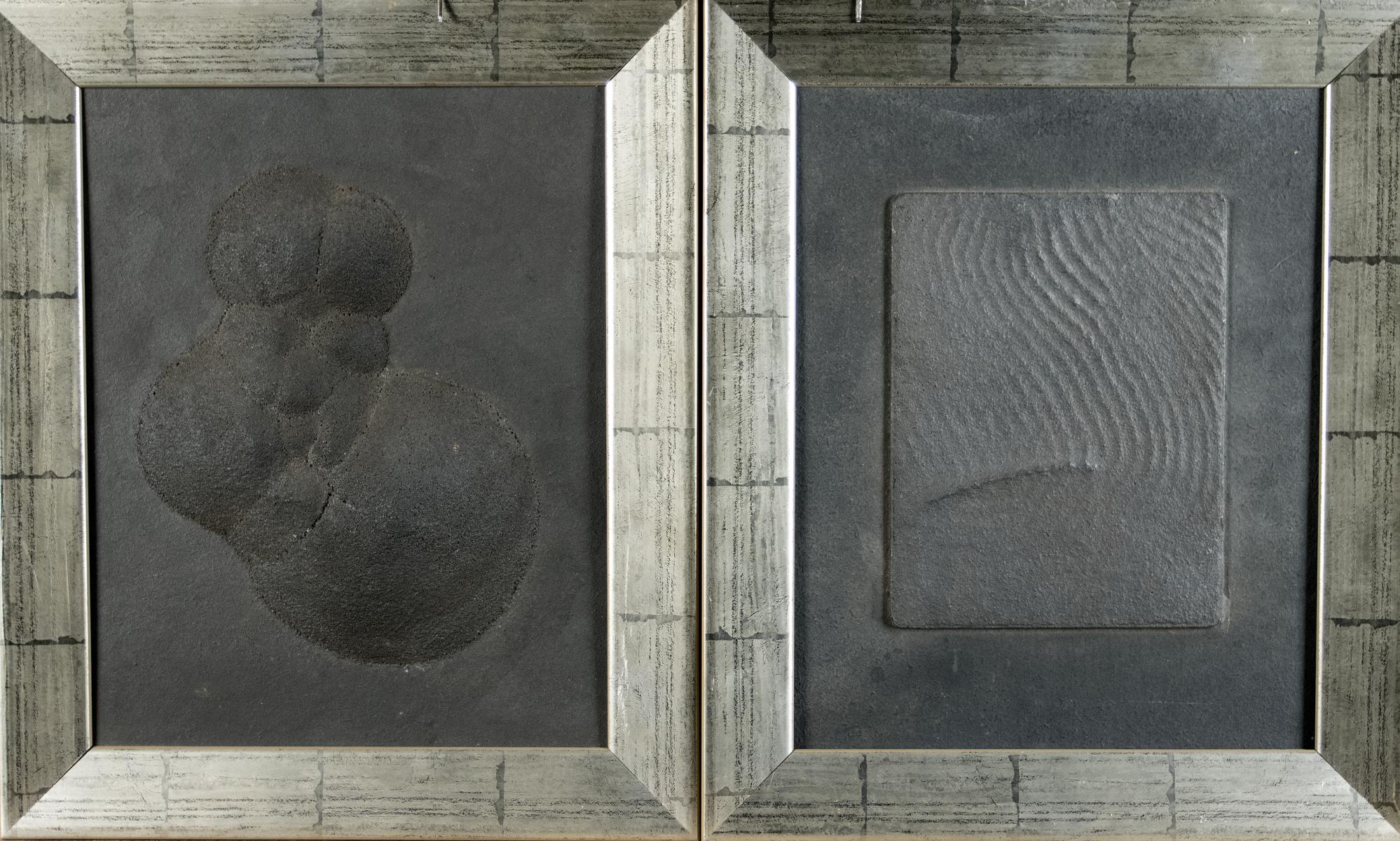 Kurt Link 1926 Köln – 1996 Düsseldorf Bildhauer, Zeichner, Konzeptkünstler und Maler; Von 1945 bis 1949 Studium an der Düsseldorfer Kunstakademie; Student der ersten Stunde in der Klasse von Ewald Mataré; Erhielt den “Prix Europe“ für Malerei der Stadt Ostende; Seit 1950 Einzel- und Gruppenausstellungen im In- und Ausland, u.a. Avantgarde im Museum Trier, Junger Westen im Museum Recklinghausen, Galerie Ludorff Düsseldorf; Ausführung zahlreicher öffentlicher und privater Arbeiten in Schulen, Parkanlagen und auf Plätzen, z. B. die Brunnenplastik, genannt Goldfinger, auf dem Jan-Wellem-Platz, Düsseldorf. Ein Paar Sandreliefs Sand, Härtungsmasse, schwarz gefasst; H je 30 cm, B je 24 cm; jeweils verso gestempelt “K. Link“