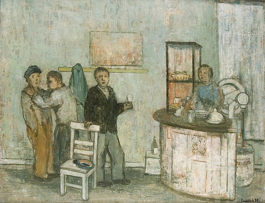Robert Pudlich 1905 Dortmund – 1962 Düsseldorf Maler, Graphiker und Bühnenbildner; Mitglied der Gruppe “Das Junge Rheinland“ und der “Rheingruppe“; vertreten u. a. im Stadtmuseum Düsseldorf. Eisdiele “Am Luftballon“ Öl auf Lwd.; H 43,5 cm, B 54,5 cm; signiert u. r. “Pudlich 35“; verso alter Klebezettel “Galerie Kurt Hackmann ‚Eisdiele‘ Robert Pudlich Düsseldorf“.