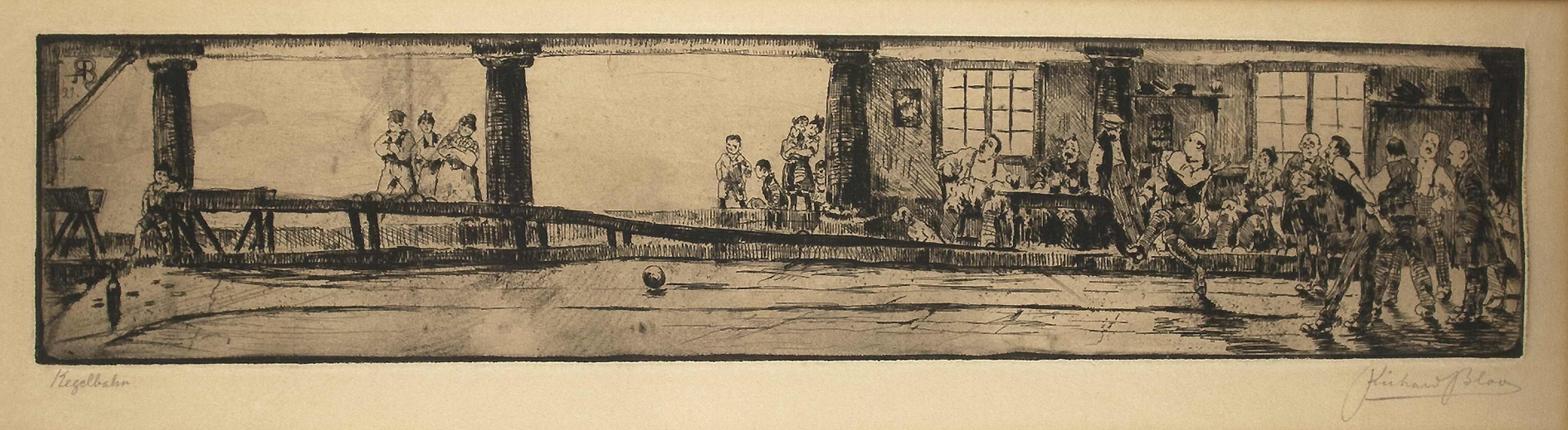Richard Bloos 1878 Brühl – 1957 Düsseldorf Maler und Grafiker in Paris und Düsseldorf; Studium an der AK Düsseldorf unter P. Janssen, W. Spatz und G. Forberg; Mitglied des Künstlerkreises im “Café du Dome“ in Paris. Kegelbahn Radierung auf Papier; H 120 mm, B 565 mm; signiert u. r. “Richard Bloos“; Modellrahmen.