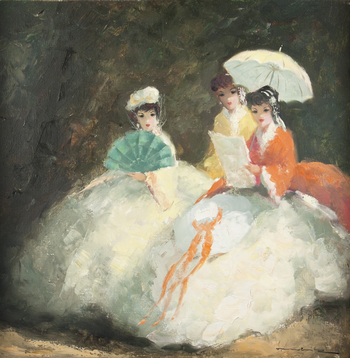 Fritz Möritz 1922 Düsseldorf – 1994 Nach einer Grafikerlehre Besuch der Kunstschule Düsseldorf; Reisen durch Belgien, Holland, Österreich, Italien und Spanien; 1955-60 Tätigkeit bei seinem Onkel Cornelius Bender in Antwerpen (Restaurator und Maler am Königlichen Museum für schöne Künste). Drei Damen Öl auf Lwd.; H 40,5 cm, B 40,5 cm; u. r. signiert.