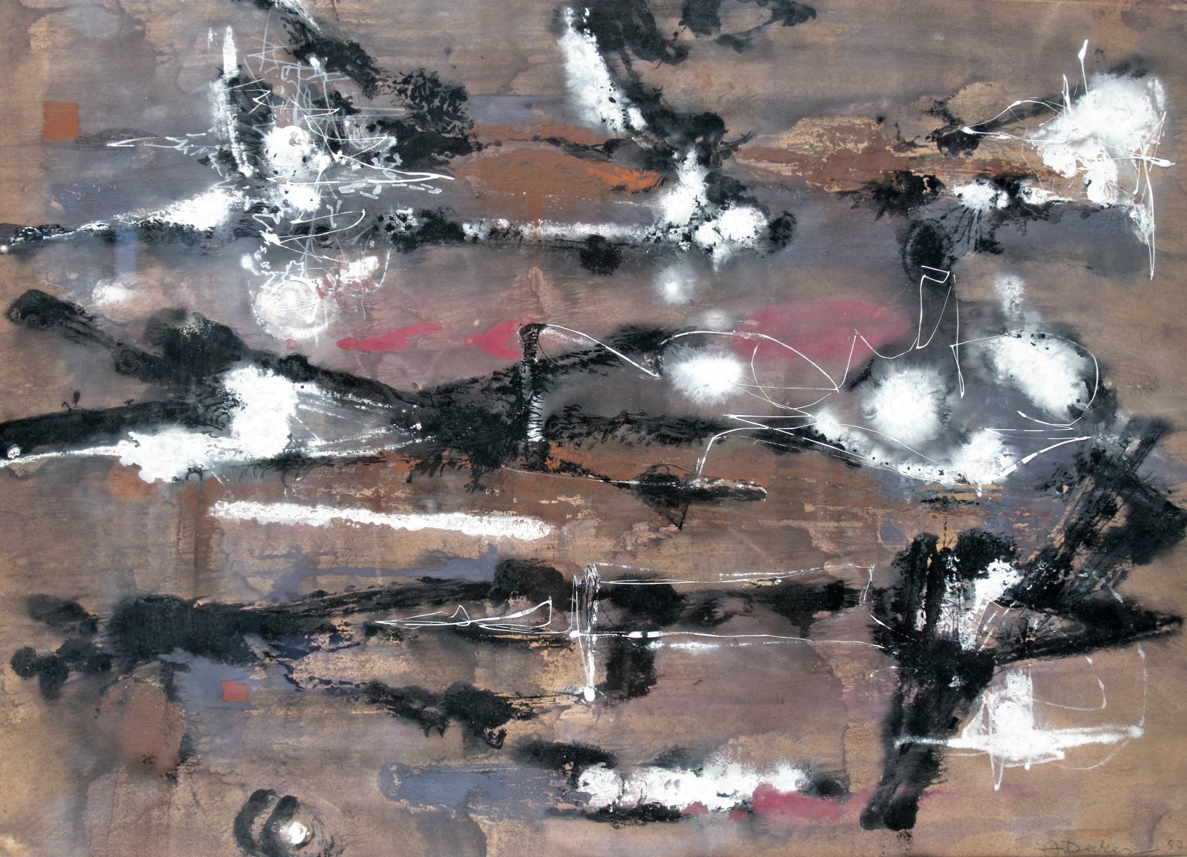 Anja Decker 1908 Berlin – 1995 München 1928 Studium an der Ecole des Beaux Arts Lausanne und an der AK München; Meisterschüler von Gulbransson; ab 1928 in Paris; 1965 Teilnahme an der Ausstellung des “Kreises Junger Kunst“ im Lenbachhaus München. Tachistische Komposition Gouache auf Papier; H 415 mm, B 557 mm; signiert und datiert “A. Decker 57“