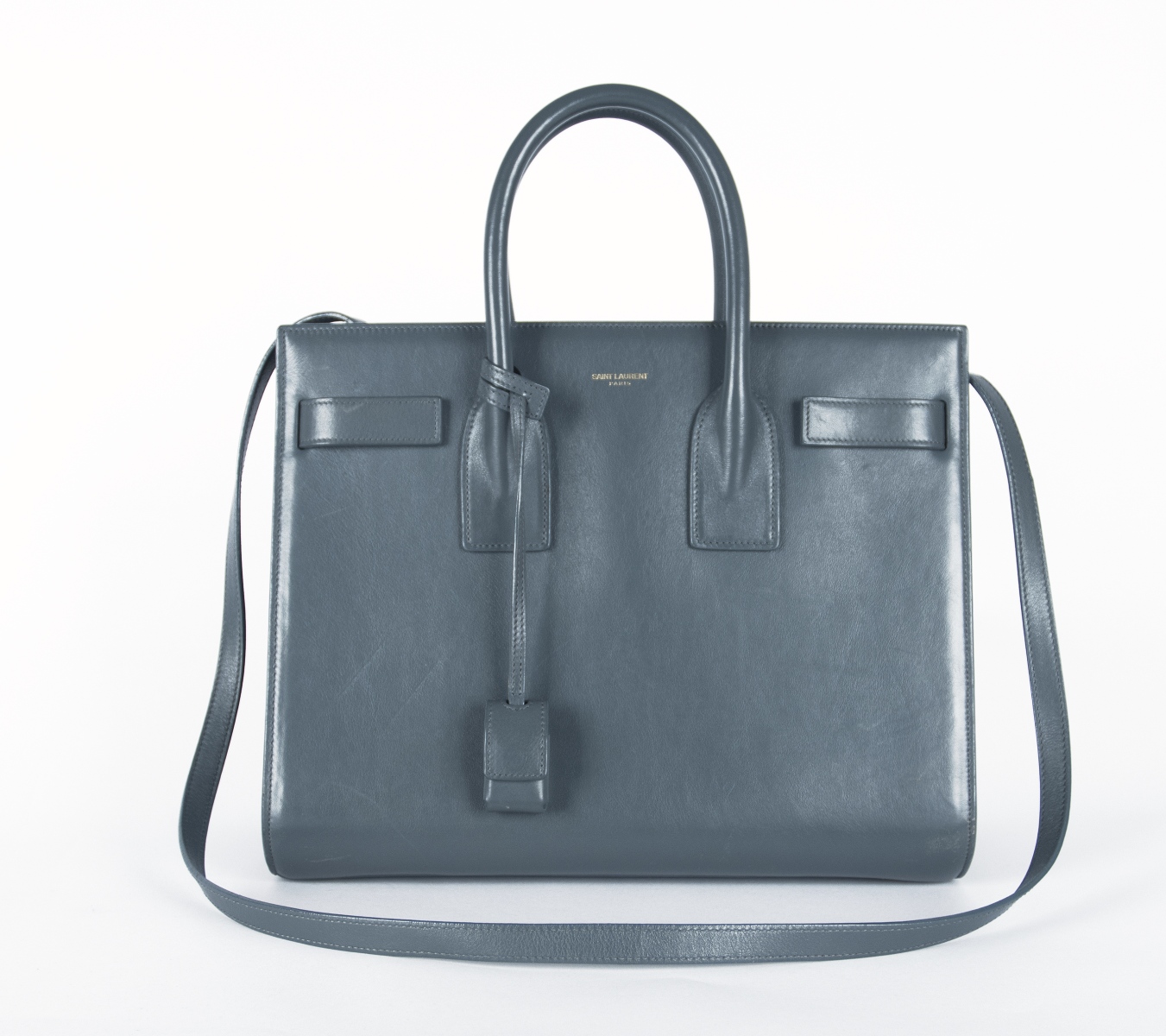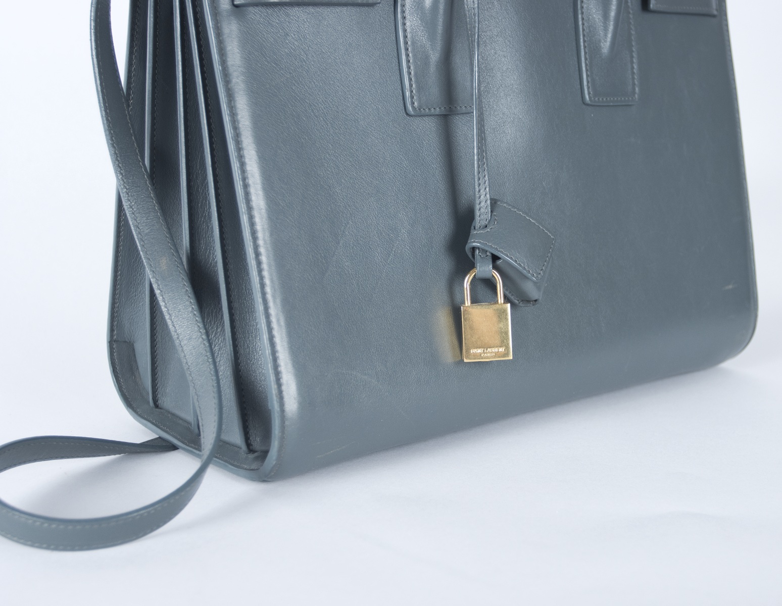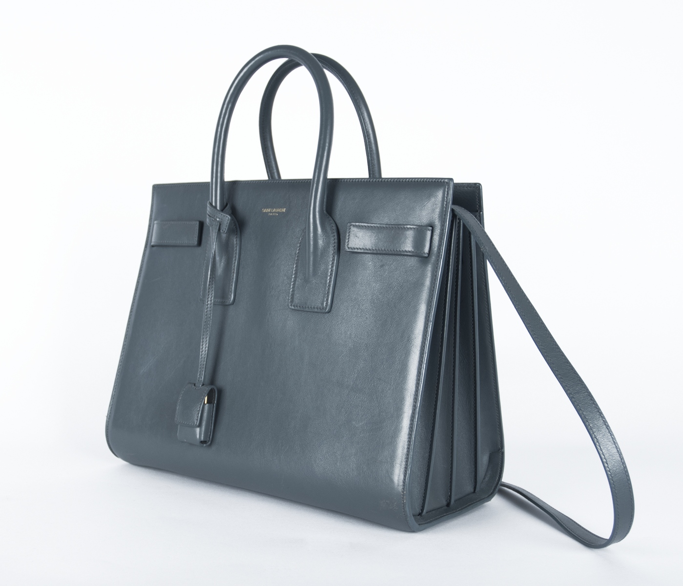 Yves Saint Laurent Sac de Jour Glattleder, Farbe Olive, mit goldfarbenen Messingbeschlägen und Schulterriemen; H 25,5 cm, B 32 cm, T 16 cm; Etikett “Saks fifth Avenue“ und weitere Etiketten sowie Staubbeutel beiliegend