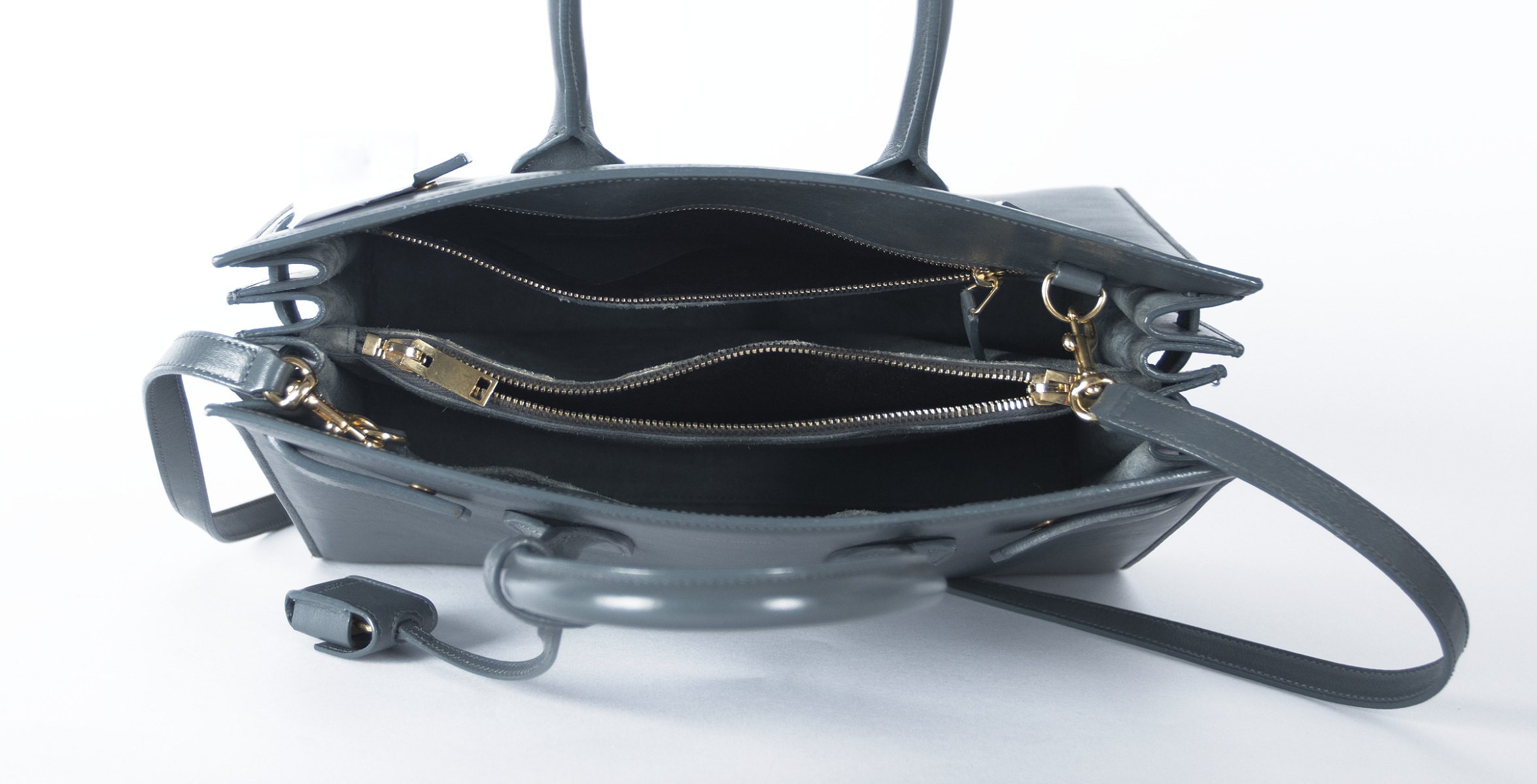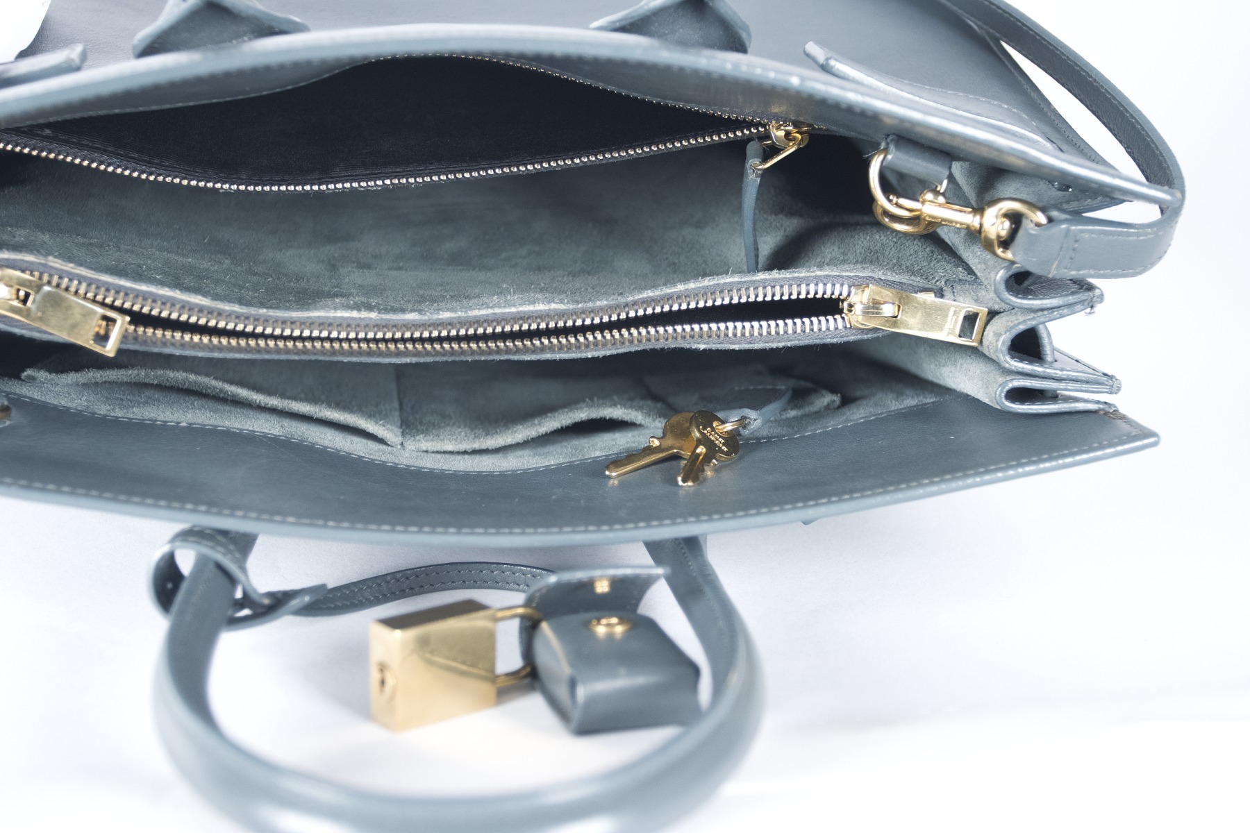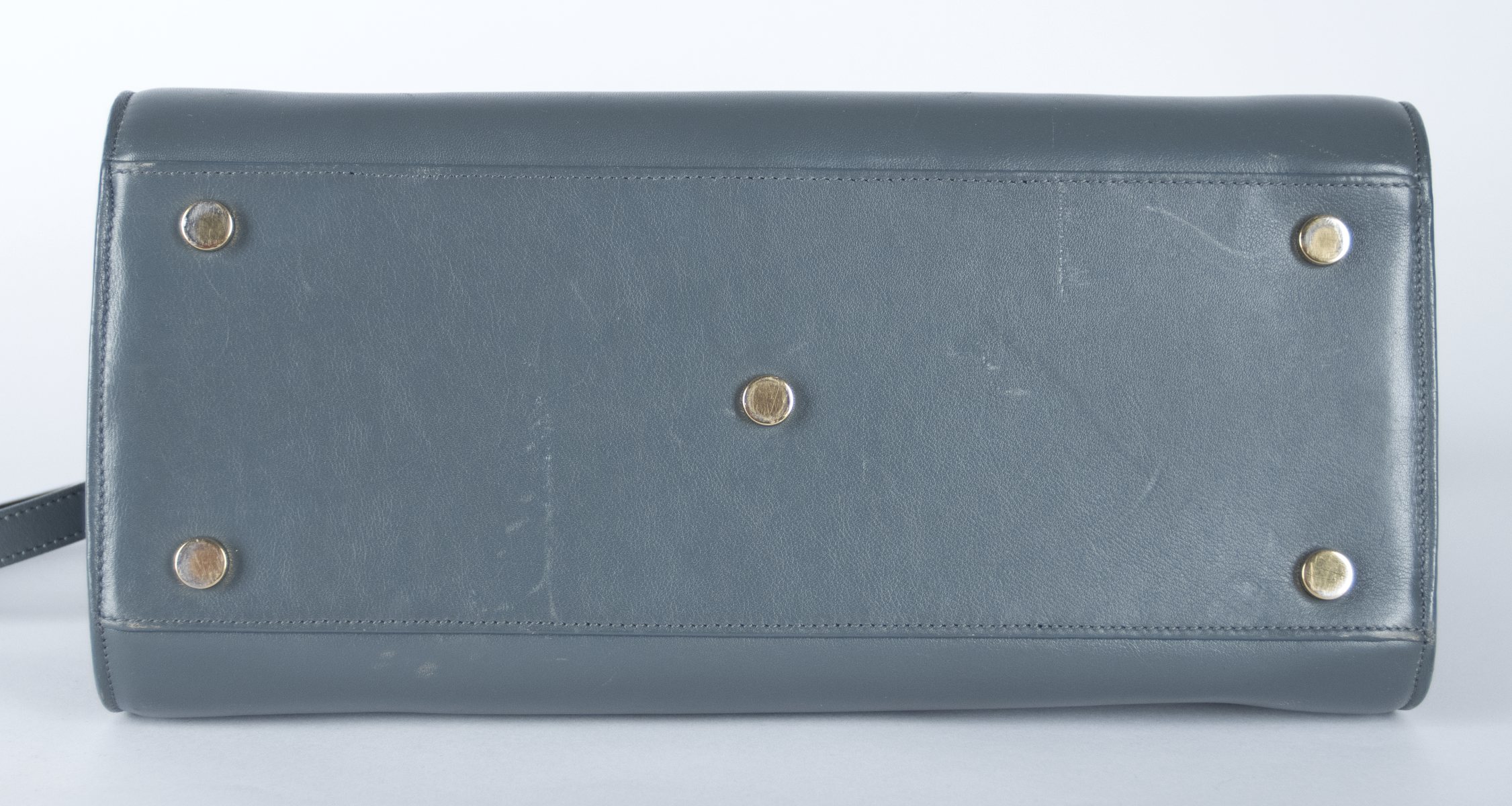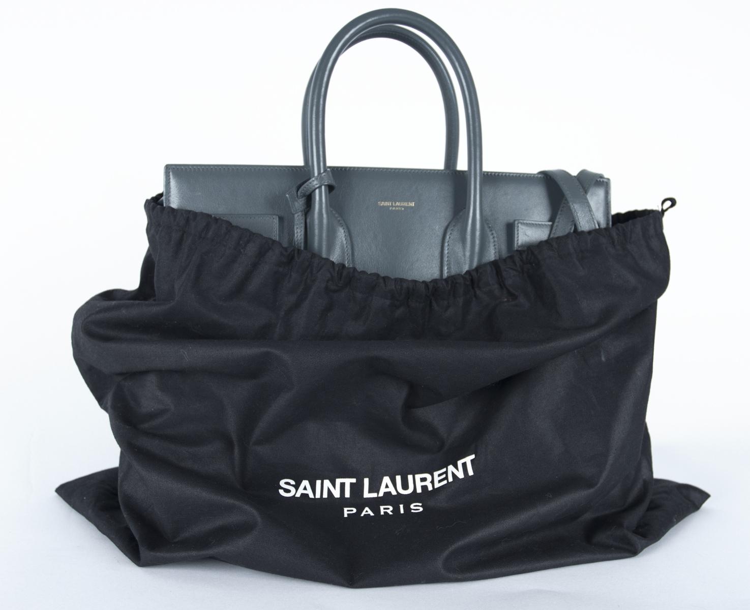 Yves Saint Laurent Sac de Jour Glattleder, Farbe Olive, mit goldfarbenen Messingbeschlägen und Schulterriemen; H 25,5 cm, B 32 cm, T 16 cm; Etikett “Saks fifth Avenue“ und weitere Etiketten sowie Staubbeutel beiliegend
