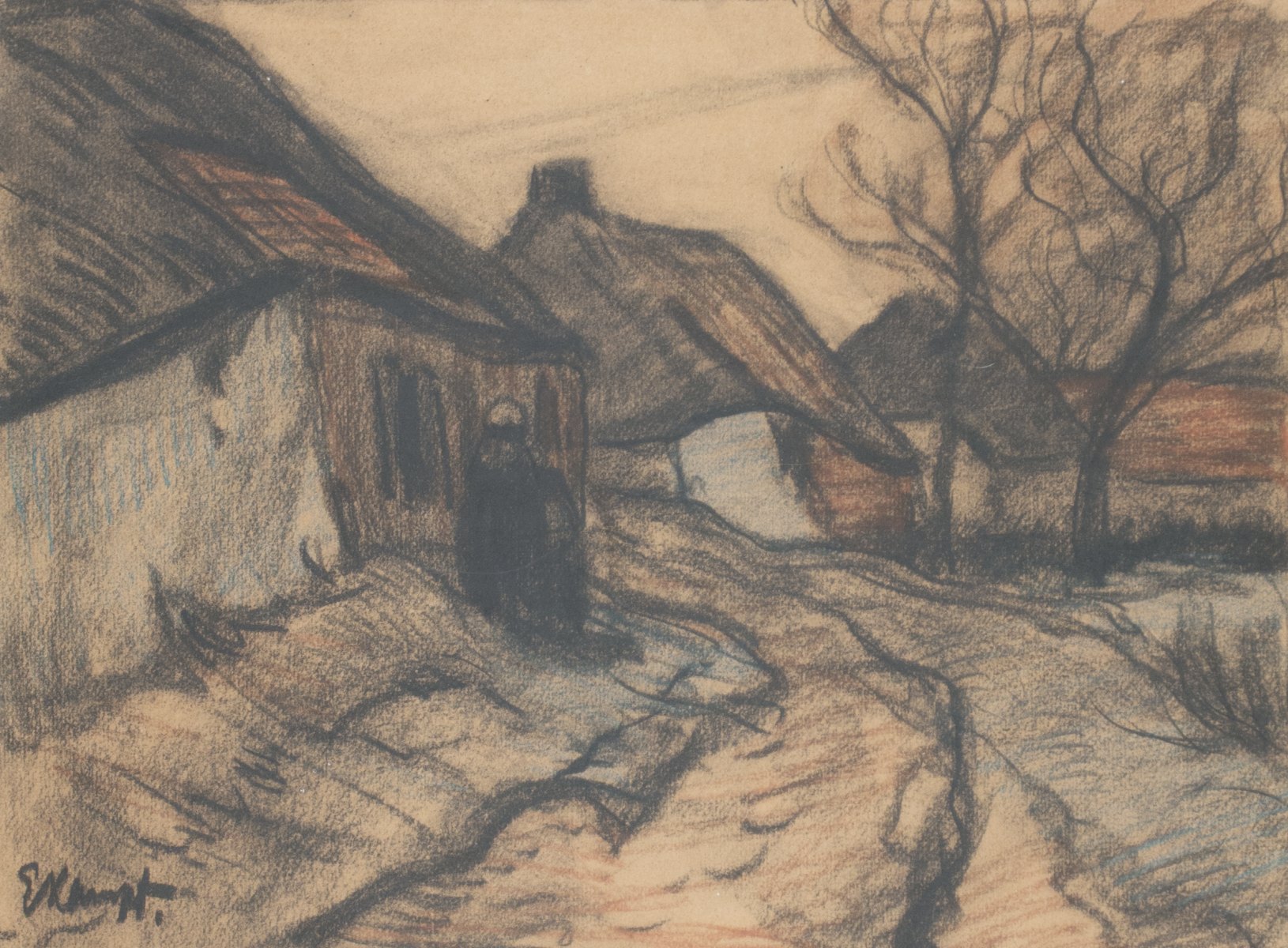 Eugen Kampf 1861 Aachen – 1933 Düsseldorf Besuchte 1878/80 die Akademie in Antwerpen, hielt sich dann studienhalber 1880/83 in Düsseldorf auf, wo er sich bei Dücker weiterbildete; Mitbegründer des “St. Lukasklubs“, der Freien Vereinigung und des Deutschen Künstlerbundes; Vorliebe für Motive aus Flandern, Holland, der Eifel und vom Niederrhein; zahlreiche Ausstellungen u. a. im Münchner Glaspalast und in Düsseldorf. Dorf in Flandern Farbige Kreiden auf Papier; H 278 mm, B 374 mm; signiert u. l. “EKampf“