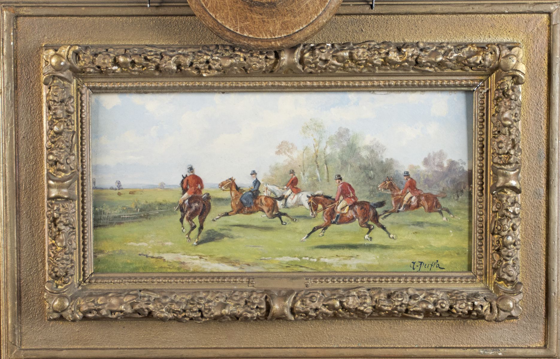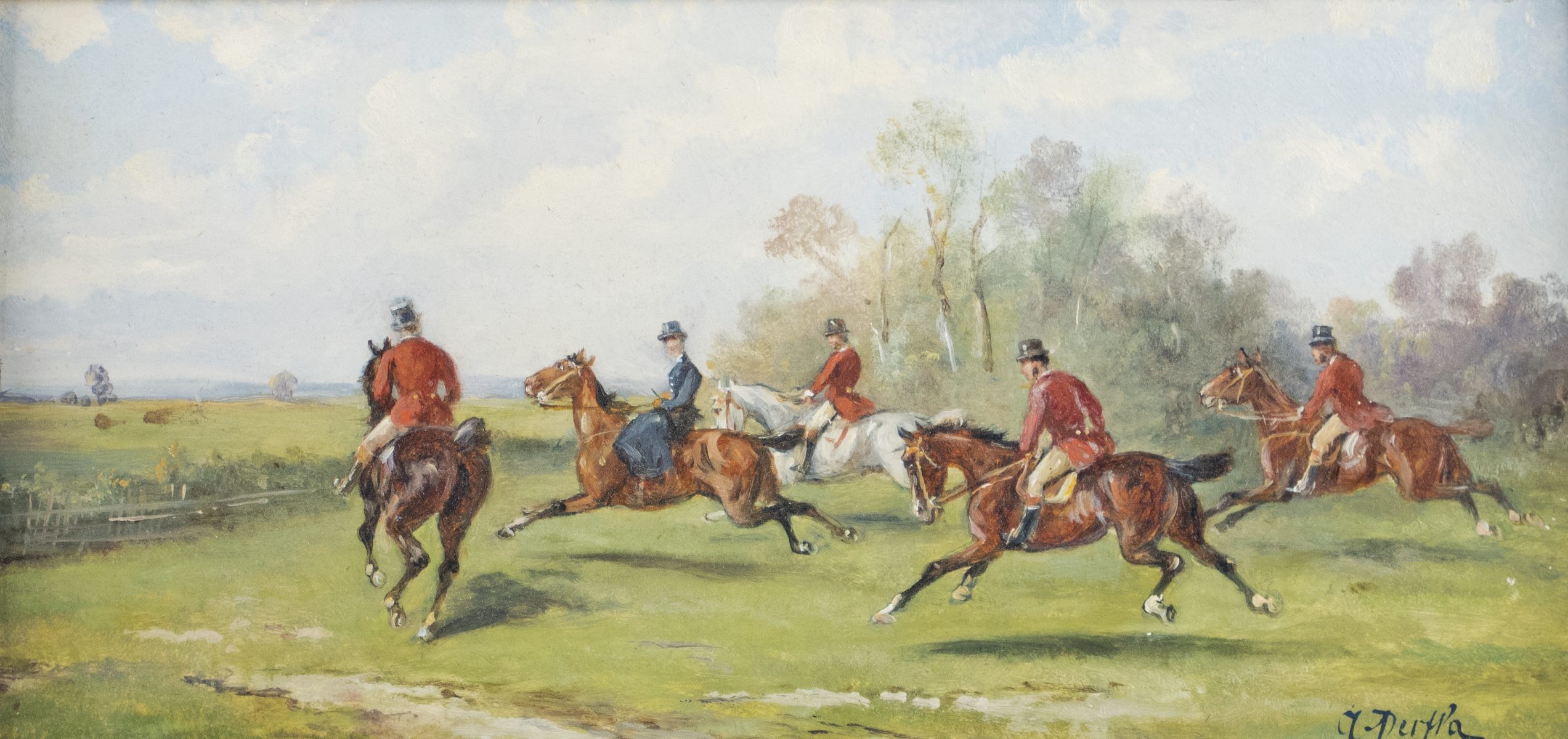 Alfred Steinacker 1838 – 1914 Jagdausritt Öl auf Holz; H 15,5 cm, B 31,5 cm; signiert u. r. mit dem Pseudonym “A Derfla“