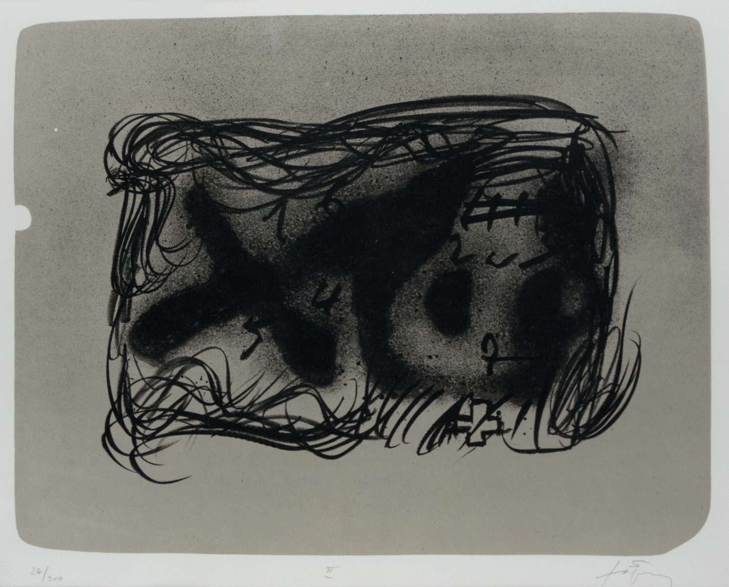 Antoni Tapies 1923 Barcelona Gilt als der wichtigste spanische Maler und Grafiker des Informel; gründete 1948 mit anderen Künstlern die Gruppe “Dau al Set“ und unter gleichem Namen eine Kunstzeitschrift; vertrat 1952 Spanien auf der Biennale in Venedig; mehrfache Teilnahme an der documenta (1959, 1964, 1968 und 1977); gründete 1984 die Stiftung Fundació Antoni Tàpies in Barcelona. Komposition Lithografie auf Papier; H 365 mm, B 475 mm; signiert u. r. “Tapies“; bezeichnet u. m. “II“; nummeriert u. l. “26/100“
