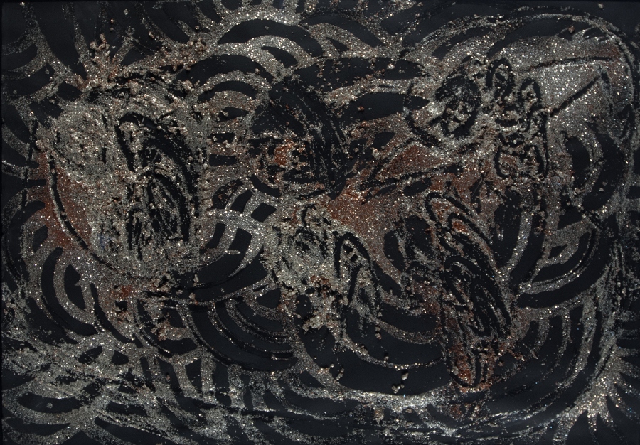 Mixed media, oil and silver glitter on heavy cardboard, 1973; H 700 mm, W 1000 mm; signed