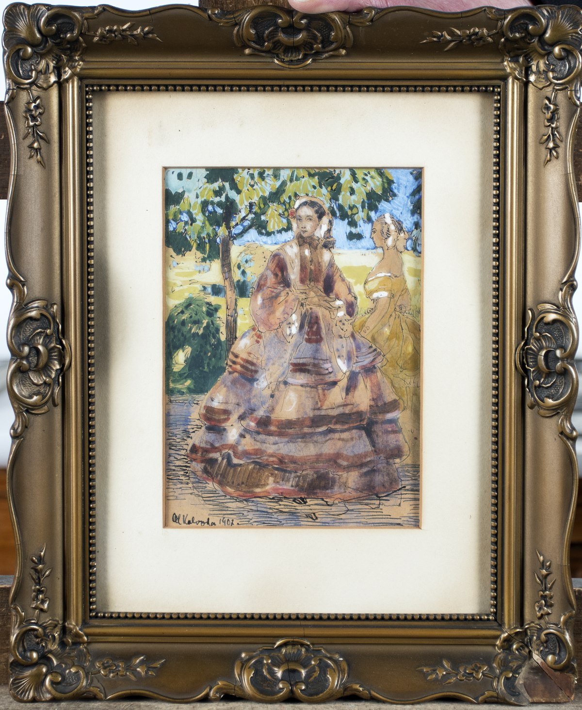 Alois Kalvoda 1875 Slapanice – 1934 Beharov Junge Frauen in Tracht Aquarell und Gouache ueber Tusche auf Papier; H 175 mm, B 125 mm (Passepartoutmass); signiert und datiert u. l. “A. Kalvoda 1907“